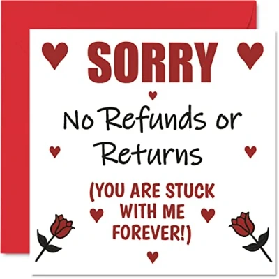 MAKE THEM LAUGH WITH THIS FUNNY ANNIVERSARY CARD FOR YOUR OTHER HALF: This exceptional quality anniversary card for her or him shows the design "Sorry No refunds or returns (you are stuck with me forever!)". If you are looking for funny anniversary cards for men, then then this happy anniversary card is bound to make them laugh. Not just for relationship gifts for women this could also be for Husband, Wife, Boyfriend, Girlfriend, Partner or Companion. WHAT DO YOU GET: The card is printed on one side and BLANK ON THE INSIDE to allow you to write your very own message. The unique fun design is printed on a specially sourced and environmentally responsible board. At 360 microns thick the natural white one-sided gloss board has a quality look and feel. Supplied with a coloured gummed envelope to complement the design and ready to be sealed and sent in the post. Wife anniversary card, Boyfriend anniversary card. NO INK SMUDGES: There is nothing worse than writing inside a card to find that the shiny surface makes the ink smudge. This is why we use a high quality one sided coated board. The uncoated side will absorb more of the ink from your pen to make smudging a thing of the past. Anniversary card Wife, anniversary card funny, anniversary card husband. SIZES: Greeting Card = 145mm x 145mm, Envelope = 155mm x 155mm, Card Thickness = 360 micron. Great Wife anniversary cards from Husband, boyfriend or girlfriend anniversary card. Husband anniversary card from wife, anniversary cards for Boyfriend. MADE AND QUALITY CHECKED IN THE UK: We print and manufacture all our product right her in the UK so you can be sure of a fast turnaround and a product that is expertly made. Using environmentally responsible premium board our card is conscious of the responsible management of the world's forests - anniversary cards for Husband, anniversary cards for Wife, funny anniversary cards for her, anniversary card for boyfriend.