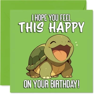 Radiates feel-good vibes with a beaming turtle and bold 'I HOPE YOU FEEL THIS HAPPY ON YOUR BIRTHDAY!' caption for instant smiles. Birthday card with a light-hearted design style Features a cheerful green turtle character, perfect for anyone who loves adorable animal motifs and playful birthday wishes. Recyclable and printed in UK for a considerate choice Printed on quality gloss single sided board with an uncoated inside-no smudging when writing inside. Eco-friendly and recyclable. Printed on 360 micron stock for a confident, premium feel Blank inside, giving you plenty of space to add your own personal message. Envelope included for easy gifting. The 145mm Square format is convenient to display or post Designed and printed in the UK using FSC-certified, so it's a card you can feel good about sending
