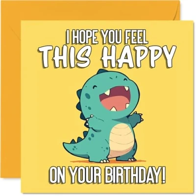 Packed with cheerful energy, this adorable dinosaur surrounded by yellow instantly puts a smile on anyone's face. Birthday card with a light-hearted design style Features a bright green dino waving from a vivid yellow background, perfect for adding a playful touch to the celebration. Recyclable and printed in UK for a considerate choice Printed on quality gloss single sided board with an uncoated inside. No smudging when writing inside. Printed on 360 micron stock for a confident, premium feel Blank inside so you can add your own special message, and comes with an envelope for easy gifting. The 145mm Square format is convenient to display or post Created in the UK using FSC certified and fully recyclable-ideal for anyone who loves a fun, eco-friendly choice