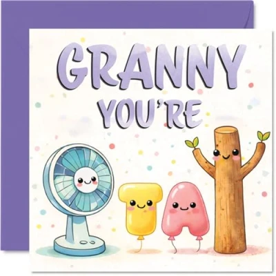 Sure to make. Granny smile, this card's lively pastel design features adorable cartoon characters and a joyful 'GRANNY YOU'RE' message out front A light-hearted motif with charming. animated figures and a soft purple palette gives it a sweet. celebratory vibe - perfect for any fun-loving gran Printed on glossy, FSC-certified board with an uncoated inside for easy writing. No smudging when writing inside, so your message stays crisp Blank inside, leaving plenty of space for your own personal words. Comes with a matching envelope for a lovely finishing touch. The 145mm Square format is convenient to display or post Designed and printed responsibly in the UK, fully recyclable for a greener greeting. Crafted to put a smile on her face and yours. Printed in the UK
