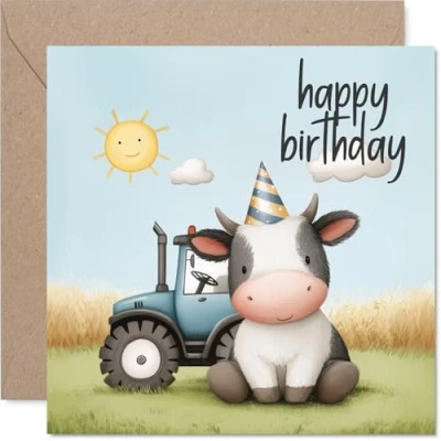 Full of cheerful charm, this card features a sweet cow donning a party hat, sure to raise a smile and warm hearts on their birthday. Birthday card with a light-hearted design style Farmyard fun takes centre stage with a playful animal motif - the adorable party-ready cow stands out against a vibrant, sunny backdrop. Recyclable and printed in UK for a considerate choice Printed on quality gloss single sided board with an uncoated inside, so there's no smudging when writing inside. Made with FSC board and fully recyclable Blank inside for your personal message, with a coordinating envelope included for a polished finish. The 145mm Square format is convenient to display or post Proudly designed and printed in the UK, offering a delightful way to celebrate with a card that feels as special as the recipient