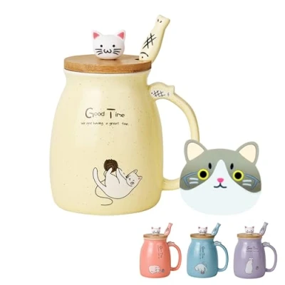 Cute Cat Mug Kawaii Ceramic Coffee Cup with Kitty Wooden Lid and Lovely Stainless Steel Spoon Novelty Morning Japanese Animal Mugs Christmas Birthday Gifts for Women Lovers Present (Yellow)