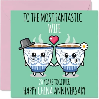MAKE THEM SMILE WITH THIS CUTE ANNIVERSARY CARD: This exceptional quality anniversary card for her or him shows the design of a cute china tea cup couple with the words "To The Most Fantastic Wife, 20 Years Together, Happy China Anniversary". If you are looking for cute anniversary cards then this card is bound to make them smile. WHAT DO YOU GET: The card is printed on one side and BLANK ON THE INSIDE to allow you to write your very own message. The unique elegant design is printed on a specially sourced and environmentally responsible board. At 360 microns thick the natural white one-sided gloss board has a quality look and feel. Supplied with a coloured gummed envelope to complement the design and ready to be sealed and sent in the post. NO INK SMUDGES: There is nothing worse than writing inside a card to find that the shiny surface makes the ink smudge. This is why we use a high quality one sided coated board. The uncoated side will absorb more of the ink from your pen to make smudging a thing of the past. SIZES: Greeting Card = 145mm x 145mm, Envelope = 155mm x 155mm, Card Thickness = 360 micron. Wife 20th Anniversary Card, Wife 20th Anniversary Card, Wifey 20th Anniversary Card. MADE AND QUALITY CHECKED IN THE UK: We print and manufacture all our product right her in the UK so you can be sure of a fast turnaround and a product that is expertly made. Using environmentally responsible premium board our card is conscious of the responsible management of the world's forests.