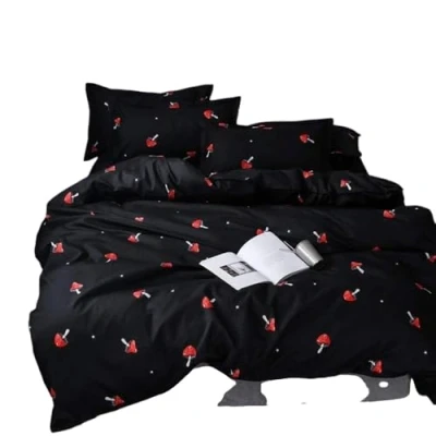 Cute Mushroom Duvet Cover Single Kid Cartoon Kawaii Bedding Set Red Shaped Comforter Farmhouse Botanical Bedspread Lovely Natural Wild Plants Quilt Black,Zipper