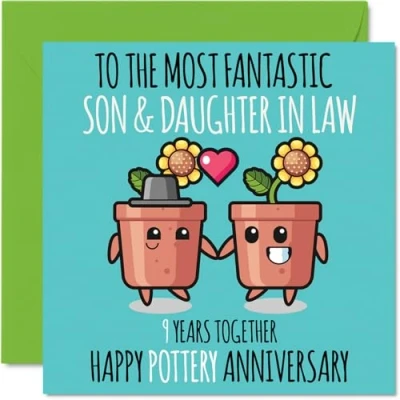 Cute Pottery Anniversary Card for Son & Daughter In Law 9 Years Together Happy 9th Wedding Cards Son, 145mm x Greeting Ninth Anniversaries