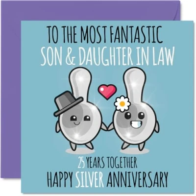 MAKE THEM SMILE WITH THIS CUTE ANNIVERSARY CARD: This exceptional quality anniversary card for her or him shows the design of a cute silver spoon couple with the words "To The Most Fantastic Son & Daughter In Law, 25 Years Together, Happy Silver Anniversary". If you are looking for cute anniversary cards then this card is bound to make them smile. WHAT DO YOU GET: The card is printed on one side and BLANK ON THE INSIDE to allow you to write your very own message. The unique elegant design is printed on a specially sourced and environmentally responsible board. At 360 microns thick the natural white one-sided gloss board has a quality look and feel. Supplied with a coloured gummed envelope to complement the design and ready to be sealed and sent in the post. NO INK SMUDGES: There is nothing worse than writing inside a card to find that the shiny surface makes the ink smudge. This is why we use a high quality one sided coated board. The uncoated side will absorb more of the ink from your pen to make smudging a thing of the past. SIZES: Greeting Card = 145mm x 145mm, Envelope = 155mm x 155mm, Card Thickness = 360 micron. Son & Daughter in Law 25th Anniversary Card, Son 25th Anniversary Card, Daughter in Law 25th Anniversary Card. MADE AND QUALITY CHECKED IN THE UK: We print and manufacture all our product right her in the UK so you can be sure of a fast turnaround and a product that is expertly made. Using environmentally responsible premium board our card is conscious of the responsible management of the world's forests.