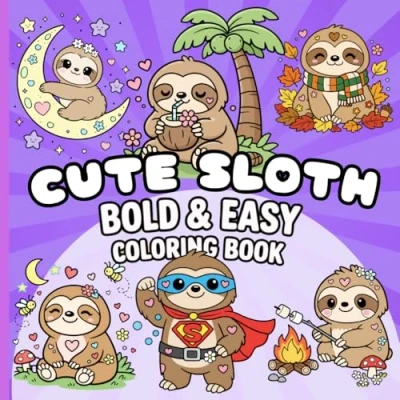 Cute Sloth Bold and Easy Coloring Book: 50 Pages for Kids Adults, Simple Designs Relaxation, Stress Relief, Creative Fun