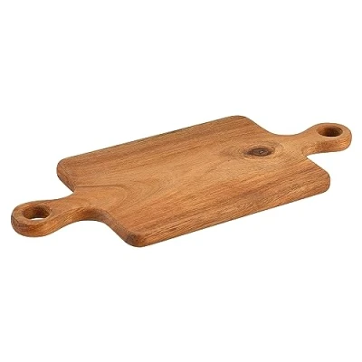 Serving board 40x18x1.5cm natural acacia wood Prepare delicious appetizers and vermouths to share and give them a different twist by serving them on these wooden boards Made of acacia wood, a durable and corrosion and moisture resistant material that will make these products stay in your kitchen for a long time. Equipped with hand grips with holes so you can easily carry it or store it hanging as a way of decoration in the kitchen. Its design follows a rustic aesthetic, respecting the natural colour of the acacia wood.