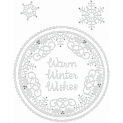 Warm Winter Wishes Frame. Christmas winter wishes circular frame with separate snowflakes. Includes pretty holly leaf, swirl designs. Separate centre sentiment: Warm Winter Wishes. This dies cuts, embosses and scores. Fits almost all of the leading die cutting machines. Height is circa 141mm edge to edge. SDD615