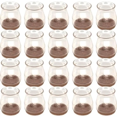 Pack of 20 TPE elastomer caps with felt, suitable for furniture legs from 18 to 28 mm in diameter; Transparent, the tip of the foot is very discreet and will not ruin the beauty of your furniture; Anti-scratch and anti-noise, long-lasting protection for fragile floors, easy installation; The footrest is very easy to assemble as it does not require any tools; Suitable for chair legs, tables, stools, consoles, cabinets, sofas and other furniture to protect parquet and delicate floors; Made of TPE elastomer, with sturdy felt for long-lasting protection and effective noise reduction; These tips are an ideal solution to preserve the integrity of your floors while improving the comfort of use of your furniture
