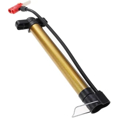 Portable hand pump for inflating the wheels of all types of bicycles/mountain bikes - compatible with small/large valve (Schrader and Presta) Total length 30 cm, supplied with hose and double head inflation port (small and large valve) Random colour