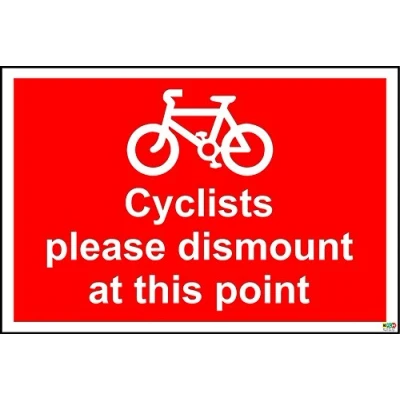 Cyclists please dismount at this point Sign 1.2mm rigid plastic 300mm x 200mm Digitally printed and laminated for extra durability Drill and screw in position or use double sided tape to mount onto suitable surface.
