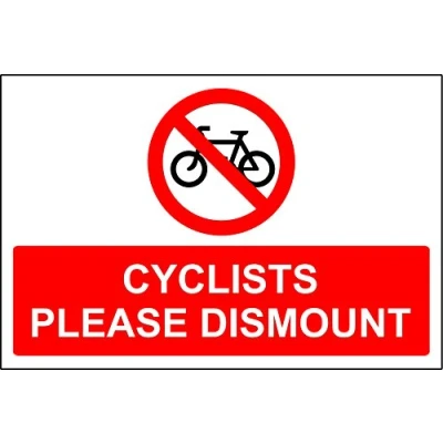 Cyclists please dismount sign 1.2mm rigid plastic 300mm x 200mm Digitally printed and laminated for extra durability Drill and screw in position or use double sided tape to mount onto suitable surface.