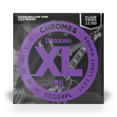 D'Addario Guitar Strings XL Chromes Electric Flat Wound Polished for Ultra Smooth Feel and Warm, Mellow Tone ECG24 PL Jazz Light, Plain Third, 11 50, 1 Pack