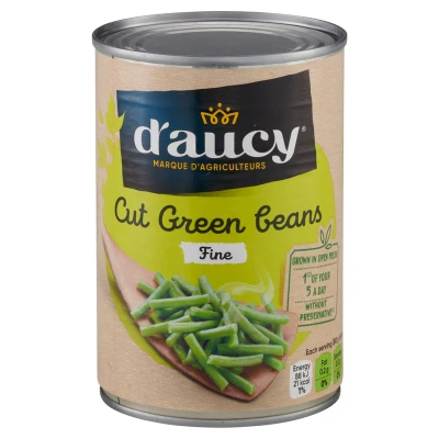 D'Aucy Green Beans Cut Fine 400g are sustainably grown in French open fields, harvested at peak maturity, and canned fresh without preservatives. Ready to cook year-round, they offer quality nutrition and traceability with a delicate taste and crisp texture.