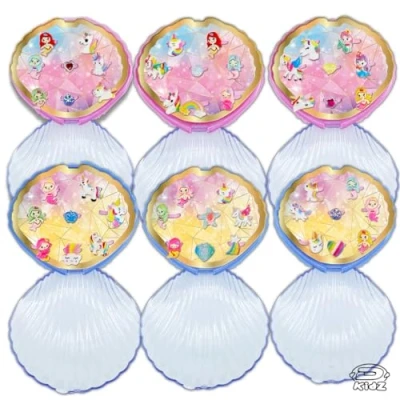 Seashell shaped jewellery box containing many colourful unicorn and mermaid rings