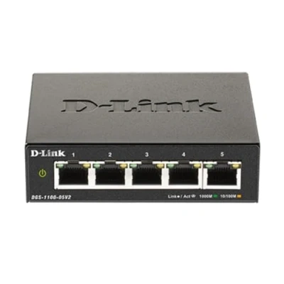 D Link DGS 1100 05V2 5 Port Gigabit Smart Managed Switch with VLAN support, layer 2 features, QoS, 802.3az EEE, Fanless