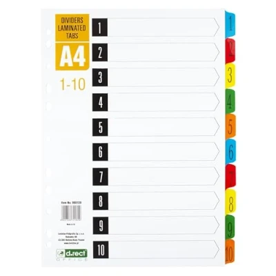 Cardboard dividers with coloured laminated tabs for sorting A4 documents. The tabs are numbered from 1 to 10 and allow for quick identification of the grouped documents The first card is used to describe the contents. The universal perforation allows you to insert into any folder. These A4 dividers are useful for sorting and organizing bills, contracts and other documents at home. They help to structure your documents clearly and easier to find.