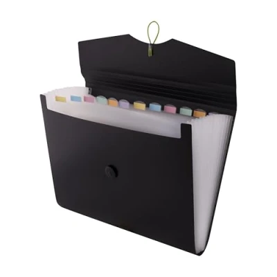 Effortless Organisation with 12 Pockets – Keep projects, notes and documents neatly separated. The A4 expanding file offers 12 internal dividers, making it easy to sort by subjects, categories or tasks—ideal for office work, study or home organisation. Secure Elastic Closure for Safe Transport – A strong elastic band keeps papers firmly in place, preventing documents from slipping out while travelling, commuting or moving between meetings. Perfect for field work, university, conferences and business trips. Durable PP Material for Long-Term Use – Made from robust, wear-resistant polypropylene film, this document folder protects contents from dirt, moisture and daily wear. Designed for reliability and longevity in any working environment. Clear Front Cover & Colour Labels – The transparent outer cover allows instant visibility of the folder’s contents, while the coloured index labels on each pocket make categorising and locating documents faster and more intuitive. Versatile for School, University & Office – Ideal for sorting worksheets, lecture notes, contracts, invoices and important paperwork. A practical tool for students, teachers, professionals and anyone who values tidy document management.