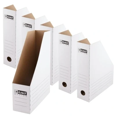 Effortless Organization for Your Workspace - Keep documents, catalogs and magazines neatly arranged with this practical 6-pack file organizer set. Perfect for maintaining order in the office, home office or study while keeping important paperwork within easy reach. Compact Yet Spacious Storage - Each holder features an 80 mm spine width, providing ample capacity for A4 files, reports and notebooks while helping you optimize shelf space and reduce desk clutter. Strong & Durable Construction - Made from sturdy E-flute cardboard with a high 330 g/m² grammage, these file holders deliver reliable stability and long-lasting use while remaining lightweight and easy to handle. Convenient Access & Smart Shape - The integrated finger hole allows quick removal from shelves, while the slanted front design ensures smooth insertion and effortless retrieval of documents. Clear Labeling for Efficient Filing - Four dedicated labeling areas make it easy to mark and categorize contents such as invoices, contracts or magazines, helping you find documents quickly and maintain an organized archive.