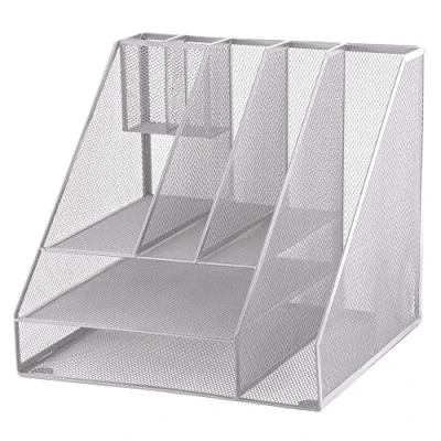 Octagonal metal desk case, painted silver. Dimensions: 288 x 310 x 288 mm (L x W x H) Equipped with 8 compartments: 2 horizontal compartments for A4 documents, 2 vertical compartments for documents, A4 catalogs, 2 vertical correspondence compartments, 2 vertical compartments for stationery and 1 colour for small office accessories, e.g. stapler, hole punch, paper clips, etc Made of metal mesh covered with silver lacquer. Special rubber feet on the bottom to prevent scratching the desk.
