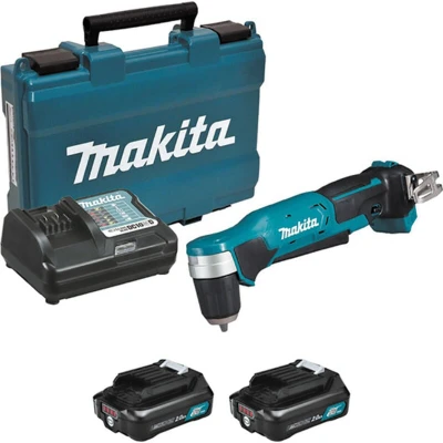 General description The Makita DA333DWAE is a versatile 12V angle drill equipped with a 10mm keyless chuck, designed for optimal performance in confined and hard-to-reach spaces. This kit includes two 2.0Ah Li-ion batteries and a charger, all conveniently packaged in a carry case. Technical specifications Voltage: 10.8 V No Load Speed: 0 - 1,100 rpm Battery Type: Lithium-ion Vibration K factor: 1.5 m/sec² Noise sound pressure: 70 dB(A) Net weight: 1.4 kg Battery Quantity: 2 x 2.0Ah Capacity in Steel: 10 mm Capacity in Wood: 12 mm Chuck Capacity: 0.8 - 10 mm Vibration (Drilling into metal): 3.0 m/sec² Usage The Makita DA333DWAE is ideal for drilling tasks in tight spaces, thanks to its compact head size and ergonomic design. The variable speed control trigger allows for precise operation, while the forward/reverse rotation feature enhances versatility. Other information Supplied with: 2 x Battery BL1020B (2.0Ah), 10.8V Charger, Belt clip, Carry case Features: Keyless Chuck, Electric