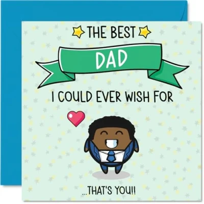 MAKE YOUR DAD SMILE WITH THIS UNIQUE BIRTHDAY CARD: This exceptional quality Dad birthday card for him shows the design 'The Best Dad I Could Ever Wish For? That?s You!!'. If you are looking for an awesome birthday card Dad for him, then then this happy birthday Dad card is bound to make him smile. Not just a birthday card for Dad this could also be a birthday gifts for Dad, Father or Papa. WHAT DO YOU GET: The card is printed on one side and BLANK ON THE INSIDE to allow you to write your very own message. The unique fun design is printed on a specially sourced and environmentally responsible board. At 360 microns thick the natural white one-sided gloss board has a quality look and feel. Supplied with a coloured gummed envelope to complement the design and ready to be sealed and sent in the post. Great Dad birthday cards, Father birthday card. NO INK SMUDGES: There is nothing worse than writing inside a card to find that the shiny surface makes the ink smudge. This is why we use a high quality one sided coated board. The uncoated side will absorb more of the ink from your pen to make smudging a thing of the past. Dad birthday cards, Dad birthday cards from Son. SIZES: Greeting Card = 145mm x 145mm, Envelope = 155mm x 155mm, Card Thickness = 360 micron. Happy birthday Dad, Dads birthday card, Dad cards birthday, birthday card Dad, happy birthday Dad card, Dad gifts from Son. MADE AND QUALITY CHECKED IN THE UK: We print and manufacture all our products right here in the UK so you can be sure of a fast turnaround and a product that is expertly made. Using environmentally responsible premium board our card is conscious of the responsible management of the world's forests - happy birthday card Dad, Dad birthday cards.