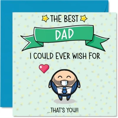 MAKE YOUR DAD SMILE WITH THIS UNIQUE BIRTHDAY CARD: This exceptional quality Dad birthday card for him shows the design 'The Best Dad I Could Ever Wish For? That?s You!!'. If you are looking for an awesome birthday card Dad for him, then then this happy birthday Dad card is bound to make him smile. Not just a birthday card for Dad this could also be a birthday gifts for Dad, Father or Papa. WHAT DO YOU GET: The card is printed on one side and BLANK ON THE INSIDE to allow you to write your very own message. The unique fun design is printed on a specially sourced and environmentally responsible board. At 360 microns thick the natural white one-sided gloss board has a quality look and feel. Supplied with a coloured gummed envelope to complement the design and ready to be sealed and sent in the post. Great Dad birthday cards, Father birthday card. NO INK SMUDGES: There is nothing worse than writing inside a card to find that the shiny surface makes the ink smudge. This is why we use a high quality one sided coated board. The uncoated side will absorb more of the ink from your pen to make smudging a thing of the past. Dad birthday cards, Dad birthday cards from Son. SIZES: Greeting Card = 145mm x 145mm, Envelope = 155mm x 155mm, Card Thickness = 360 micron. Happy birthday Dad, Dads birthday card, Dad cards birthday, birthday card Dad, happy birthday Dad card, Dad gifts from Son. MADE AND QUALITY CHECKED IN THE UK: We print and manufacture all our products right here in the UK so you can be sure of a fast turnaround and a product that is expertly made. Using environmentally responsible premium board our card is conscious of the responsible management of the world's forests - happy birthday card Dad, Dad birthday cards.