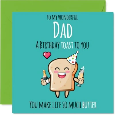 MAKE YOUR DAD SMILE WITH THIS UNIQUE BIRTHDAY CARD: This exceptional quality Dad birthday card shows the design 'To my wonderful Dad a birthday toast to you. You make life so much better'. If you are looking for a beautiful birthday card Dad, then then this happy birthday Dad card is bound to make them smile. Not just a birthday card for Dad this could also be a birthday gifts for Dad, Father or Papa. WHAT DO YOU GET: The card is printed on one side and BLANK ON THE INSIDE to allow you to write your very own message. The unique fun design is printed on a specially sourced and environmentally responsible board. At 360 microns thick the natural white one-sided gloss board has a quality look and feel. Supplied with a coloured gummed envelope to complement the design and ready to be sealed and sent in the post. Dad Fathers Day cards, Father birthday cards, Papa birthday card. NO INK SMUDGES: There is nothing worse than writing inside a card to find that the shiny surface makes the ink smudge. This is why we use a high quality one sided coated board. The uncoated side will absorb more of the ink from your pen to make smudging a thing of the past. Dad birthday cards, Dad birthday cards from Son. SIZES: Greeting Card = 145mm x 145mm, Envelope = 155mm x 155mm, Card Thickness = 360 micron. Happy birthday Dad, Dads birthday card, Dad cards birthday, birthday card Dad, happy birthday Dad card, Dad gifts from Son. MADE AND QUALITY CHECKED IN THE UK: We print and manufacture all our products right here in the UK so you can be sure of a fast turnaround and a product that is expertly made. Using environmentally responsible premium board our card is conscious of the responsible management of the world's forests - happy birthday card Dad, Dad birthday cards.