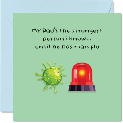 MAKE YOUR DAD SMILE WITH THIS BEAUTIFUL BIRTHDAY CARD: This exceptional quality Dad birthday card for His shows the design My Dads the strongest person I know… until he has man flu. If you are looking for a beautiful birthday card for him, then then this happy birthday Dad card is bound to make him smile. Not just a birthday card for Dad this could also be a Fathers Day card for Dad. WHAT DO YOU GET: The card is printed on one side and inside bears the message 'Love You Dad' with space to allow you to write your very own message. The unique fun design is printed on a specially sourced and environmentally responsible board. At 360 microns thick the natural white one-sided gloss board has a quality look and feel. Supplied with a coloured gummed envelope to complement the design and ready to be sealed and sent in the post. NO INK SMUDGES: There is nothing worse than writing inside a card to find that the shiny surface makes the ink smudge. This is why we use a high quality one sided coated board. The uncoated side will absorb more of the ink from your pen to make smudging a thing of the past. Dad Fathers Day cards, Dad Birthday cards from Son. SIZES: Greeting Card = 145mm x 145mm, Envelope = 155mm x 155mm, Card Thickness = 360 micron. Happy Birthday Dad, Dads Birthday card, Dad cards Birthday, Birthday card Dad, happy Fathers Day Dad from Daughter gifts, happy Birthday Dad card, Fathers Day cards Dad, Dad gifts from Son, happy first Birthday as my Dad. MADE AND QUALITY CHECKED IN THE UK: We print and manufacture all our product right her in the UK so you can be sure of a fast turnaround and a product that is expertly made. Using environmentally responsible premium board our card is conscious of the responsible management of the world's forests - happy birthday card Dad, Dad birthday cards.