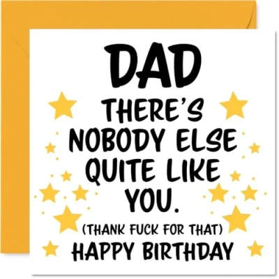 MAKE YOUR DAD SMILE WITH THIS UNIQUE BIRTHDAY CARD: This exceptional quality Dad birthday card shows the design 'Dad Theres nobody else quite like you. (Thank fuck for that) Happy Birthday'. If you are looking for an awesome birthday card for Dad, then then this happy birthday Dad card is bound to make them smile. Not just a birthday card for Dad this could also be a birthday gifts for Dad, Father or Papa. WHAT DO YOU GET: The card is printed on one side and BLANK ON THE INSIDE to allow you to write your very own message. The unique fun design is printed on a specially sourced and environmentally responsible board. At 360 microns thick the natural white one-sided gloss board has a quality look and feel. Supplied with a coloured gummed envelope to complement the design and ready to be sealed and sent in the post. Great Dad birthday cards, Father birthday card. NO INK SMUDGES: There is nothing worse than writing inside a card to find that the shiny surface makes the ink smudge. This is why we use a high quality one sided coated board. The uncoated side will absorb more of the ink from your pen to make smudging a thing of the past. Dad birthday cards, Dad birthday cards from Son. SIZES: Greeting Card = 145mm x 145mm, Envelope = 155mm x 155mm, Card Thickness = 360 micron. Happy birthday Dad, Dads birthday card, Dad cards birthday, birthday card Dad, happy birthday Dad card, Dad gifts from Son. MADE AND QUALITY CHECKED IN THE UK: We print and manufacture all our products right here in the UK so you can be sure of a fast turnaround and a product that is expertly made. Using environmentally responsible premium board our card is conscious of the responsible management of the world's forests - happy birthday card Dad, Dad birthday cards.