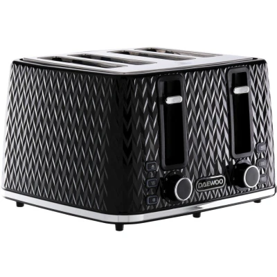 JoybuyThe Daewoo Argyle 4 Slice Toaster (SDA1863GE) features wide slots, dual independent controls, 7 browning levels, and functions for reheat, defrost, and cancel. Its stylish argyle design, high bread lift, non-slip base, and removable crumb trays make it a practical and elegant choice for any kitchen.