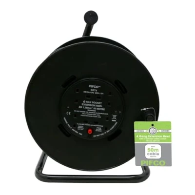 Daewoo Extension Reel, 4 Way Socket with 50 Metre Cable, Heavy Duty Resettable Safety Cut Out, Open Frame, Black and Green