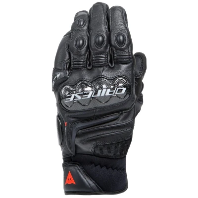 Dainese Carbon 4 Sport Gloves Short black / black The Dainese Carbon 4 short motorbike gloves are a sporty, short model that combines comfort, freshness and ventilation thanks to the mesh inserts on the back of the hand with the highest safety standards. These are guaranteed by the DCP protection system on the little finger, the resistance of the leather and the knuckle protectors in carbon, designed for maximum ergonomics and a comfortable fit. Features: Short leather motorbike gloves with mesh inserts, DCP system and carbon knuckle protectors Perforation on the inside of the finger Adjustable cuff strap Elastic Microelastic inserts Neoprene cuff Pre-curved fingers Elastic inserts Dainese Smart Touch Soft inserts Main materials: Super soft Amica suede palm Mesh fabric inserts Micro sheepskin Goatskin reinforcement between thumb, index finger and palm Safety: Composite carbon fibre inserts on knuckles DCP system on the little finger Single leather plate the size of the hand Polyurethane insert on the knuckles and palm of the hand Cat. II EN 13594/2015 standard Cat. II Lev.1