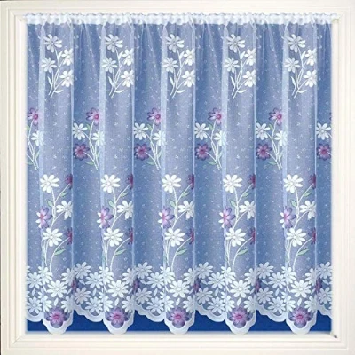 A Pretty Daisy in shades of Purple Lilac lavender and Pink marigold flowered net Curtain Customers should order at least double the width of their window for gathering. Quantity 1 = 1 Metre Width, Quantity 2 = 2 Metre Width (Comes as one piece) Quantity 3 = 3 Metres Width (Comes as one piece) etc. In the drop-down quantity box choose the metreage you require for your net, for example, for 2 metres of net you would select 2 in the quantity box. Orders will all be sent as one piece unless otherwise requested. Slotted ready for a wire or net rod Machine washable cool wash In the drop down quantity box choose the metreage you require for your net, for example, if you require 2 Metres of net you would select 2 in the quantity box The basket will combine orders of the same drop size so either pay for them separately or order the total amount of metres you need and let us know your cutting instructions. Net Curtains Ideal for reducing glare and heat from the sunshine through your windows PLEASE BE AWARE QUANTITY 2 DOES NOT MEAN 2 PIECES. QUANTITY IS HOW WIDE THE NET IS IN METRES ONE PIECE