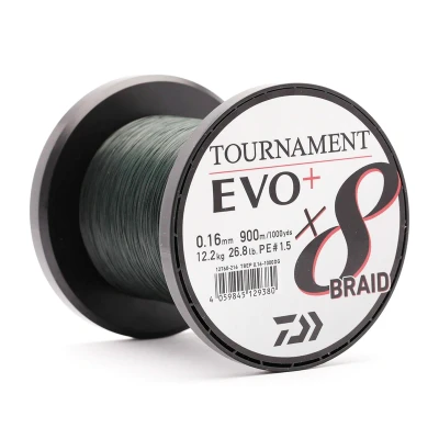 Daiwa Tournament x8 EVO+ - Braided line - Composed of 8 strands - Length: 900m - Available in several diameters - Diameter / Break strength: 0.08mm / 4.9kg - Diameter / Break strength: 0.10mm / 6.7kg - Diameter / Break strength: 0.12mm / 8.6kg - Diameter / Break strength: 0.14mm / 10.2kg - Diameter / Break strength: 0.16mm / 12.2kg - Diameter / Break strength: 0.18mm / 15.8kg - Diameter / Break strength: 0.20mm / 18.0kg - Diameter / Break strength: 0.26mm / 19.8kg - Color:Dark Green - Silicone coating - High breaking strength - High knot strength - Super round profile - Non-stretch - High sensitivity and responsiveness - Suitable for both spinning reels and baitcasting reels The Daiwa Tournament 8 Braid Evo+ is among the best braided lines on the market. The renewed, special 8-strand compound results in an ultra thin, round and extremely strong line. This line is great for feeder fishing, beach fishing, predator fishing and even catfish fishing.