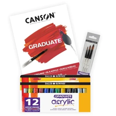 The Graduate Collection is specifically designed to meet the needs of beginner artists and students who want to practice and perfect their skills. Graduate Acrylic colours are of good pigment strength and flow easily across paper and primed surfaces or canvas, indoors or outdoors. The Multi-Technique Graduate Brushes have ergonomic, balanced short handles for great comfort. The Canson Acrylic Paper Pad is ideal for wet techniques such as acrylic and oil painting.