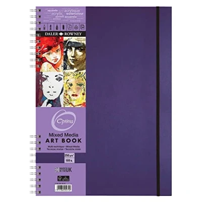 Daler Rowney Optima Mixed Media Artbook, Lightly Textured, 250 gsm, 169lb, Spiral Bound, Hardback, Portrait, Elastic Closure, A3 29.7 x 42 cm, Amethyst Cover, 30 sheets