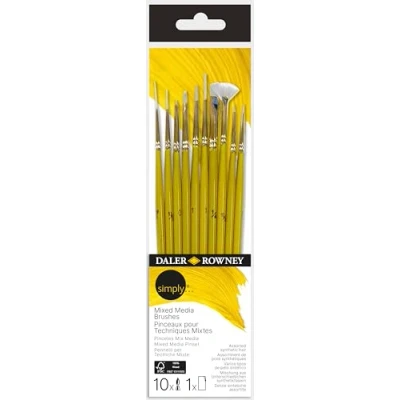 Daler Rowney, Simply, Multi Technique, Assorted Synthetic Hair, Short Handle, Liner,Script, Spotter, Angle, Flat Shader, Filbert, Fan, Multiple sizes, Reuseable Ziplock Pouch, 10 brushes, Wood, Yellow