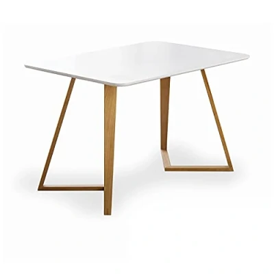 Scandinavian-Inspired Elegance: Features a minimalist design with chevron-style wooden legs, combining sturdy support with a unique, eye-catching aesthetic. Durable & Easy to Clean: The laminated tabletop with a subtle satin sheen ensures effortless cleaning and maintenance, perfect for everyday use. Two Finish Options: Choose between a grained oak veneer or satin-smooth white finish to suit your style and home decor preferences. Versatile Functionality: Ideal as a dining table or home office desk, adding a modern touch to any room while offering practicality and charm.