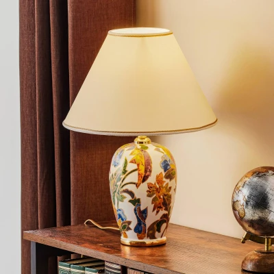 High-quality workmanship and appearance - Damasco table lamp The Damasco table lamp is sumptuous and elegant, and not only impresses with its high-quality material mix of ceramic, textile and 24-carat gold trim. The use of the classic Form of the lampshade is combined with a base that is reminiscent of amphorae and can therefore be perfectly integrated into classic ambiences. In addition to the classic look, Damasco is given a fresh touch by the pattern, which is applied by hand using decorative moulds and then fired into the vase. Only the white textile shade in the shape of a cone is gold-plated at the ends and kept rather plain. It lends the light a calm radiance and gently directs the light of the light source to be used through the white lampshade into the surroundings. The Damasco table lamp is a unique and decorative lighting object for living rooms and hotel interiors.