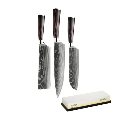 The perfect set that really adds something to the kitchen! Complete in one go with the razor-sharp 3-piece knife set and luxurious double-sided sharpening stone from Shinrai. People who cut a lot probably suffer from it at some point. Knives that get blunt very quickly and blades where the cut food always sticks to the knife. With this razor-sharp knife set from Shinrai , that is a thing of the past, especially in combination with the luxurious double-sided sharpening stone. High Quality Materials & Exceptional Precision * Premium High Carbon Steel : Hard, sharp and durable for long lasting performance * Beautiful Damascus Print : Elegant and functional, ideal for any kitchen * Razor-sharp 3-piece knife set : Including chef's knife, Santoku knife and Nakiri knife * Luxury Gift Box : Protects the knives during transport and provides a beautiful presentation. * Unique Deal : The ultimate set for every kitchen enthusiast The Combiset Contains * Chef's knife (20 cm) : Perfect for cutting, chopping and dicing * Santoku Knife (18 cm) : Suitable for versatile use * Nakiri Knife (18 cm) : Ideal for cutting vegetables and chopping * Luxury Double-Sided Sharpening Stone : To maintain the sharpness of your knives Comfort & Perfect Grip * Pakka Wooden Handles : This hardwood has a characteristic dark texture that provides the perfect grip while cutting. * Bolster for Extra Safety : The bolster separates the handle from the blade and provides extra safety when cutting. A Beautiful Gift The knives are always delivered in a beautiful gift box. This ensures that the knives are protected during transport and ensures a smile when you receive it. Double-sided sharpening stone If you use your knives regularly, they can lose their sharpness. With sharpening stones, you can ensure that you retain the sharpness of your knives and enjoy the cutting comfort for longer. The sharpening stone has two sides with different grit sizes: a coarse and a small grit. This means you don't have to invest in two sharpening stones. Make your knives even sharper than with regular knife sharpeners. How do you use a sharpening stone? To get your knife razor sharp, you go through three steps: pre-sharpening, fine-sharpening and polishing. When pre-sharpening, you use a coarse sharpening stone (up to grit 600) to restore the cutting edge to the correct angle and remove damage. Then, fine-sharpening with a finer sharpening stone (600-3000) ensures that the edge becomes smoother and sharper. Finally, polishing completes the finish; with a very fine sharpening stone (3000+) or a strop you remove the last impurities, giving the knife a mirror-smooth and extremely sharp edge. With this method, your knives remain in top condition for effortless cutting. If you use your knives regularly, they can lose their sharpness. With sharpening stones you can ensure that you keep the sharpness of your knives and can enjoy the cutting convenience for longer. Made of a coarse and small grit, the sharpening stone contains two sides with different grit sizes. This means you don't have to invest in two sharpening stones.