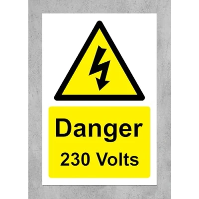 Danger 230 volts electricity Safety sign Self adhesive sticker 300mm x 200mm Digitally printed and laminated for extra durability Remove backing film and apply to dry, smooth, oil free surface.