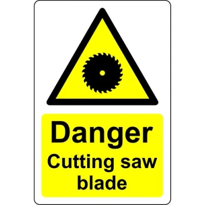 Danger cutting saw blade Safety sign 1mm Plastic sign Digitally printed for extra durability Drill and screw in position or use double sided tape to mount onto suitable surface.