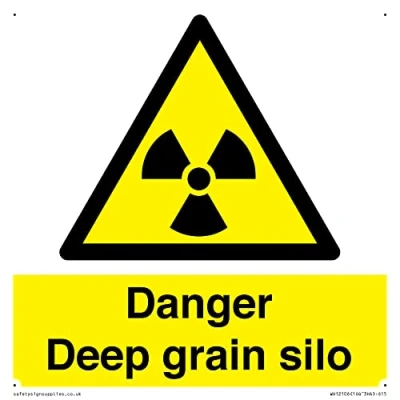 W003 : Radioactive material or ionizing radiation This sign is made from plastic semi-rigid 1mm Comes with3mm Corner Holes. 1mm thin plastic sign, can be screwed, stuck with adhesive, or attached with cable ties. Not suitable for hanging. S15 square Sign Text: Danger Deep grain silo