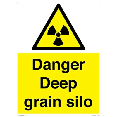 W003 : Radioactive material or ionizing radiation This sign is made from plastic semi-rigid 1mm Comes with4mm Corner Holes. 1mm thin plastic sign, can be screwed, stuck with adhesive, or attached with cable ties. Not suitable for hanging. A3 portrait Sign Text: Danger Deep grain silo