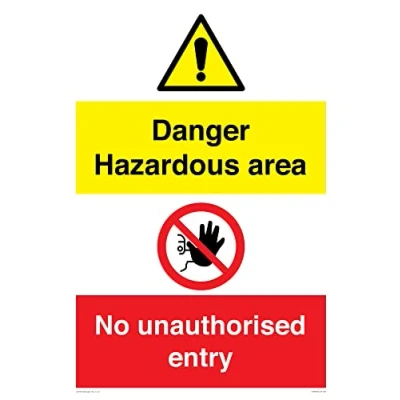 W001 : General Warning, P905 : No access This sign is made from vinyl / sticker Air Release vinyl makes it easy to stick to flat, clean surfaces without bubbles. Not for rough, plastic or dusty surfaces. A2 portrait Sign Text: Danger Hazardous area No unauthorsied entry