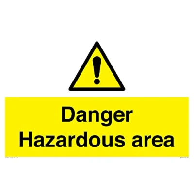 W001 : General Warning This sign is made from vinyl / sticker Air Release vinyl makes it easy to stick to flat, clean surfaces without bubbles. Not for rough, plastic or dusty surfaces. A2 landscape Sign Text: Danger Hazardous area
