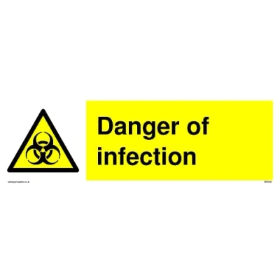 W009 : Biological hazard This sign is made from vinyl high tack A stickier sticker. Uses a stronger adhesive to make it more suitable for plastic surfaces like Wheelie Bins or where the sticker might get rubbed. 31 landscape Sign Text: Danger of infection with biological hazard symbol.