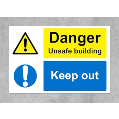 Danger unsafe building keep out sign 3mm Aluminium sign 300mm x 200mm Digitally printed and laminated for extra durability 10mm Radius rounded corners, no sharp edges